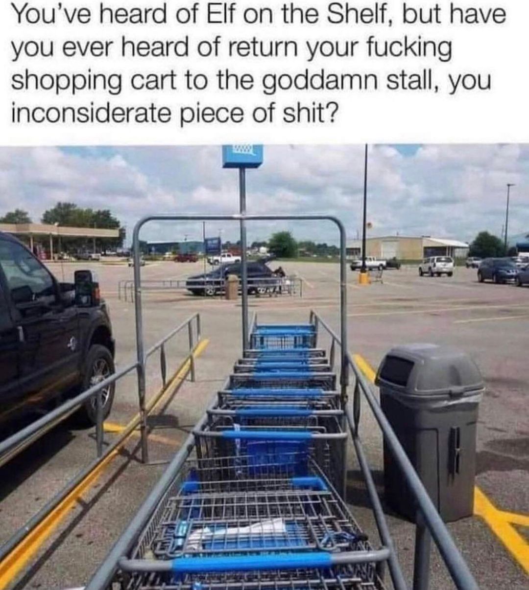 You've heard of Elf on the Shelf, but have you ever heard of return your fucking shopping cart to the goddamn stall, you inconsiderate piece of shit?