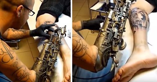 Tattoo artist gets his prosthetic replaced with a detachable tattooing needle/machine.
