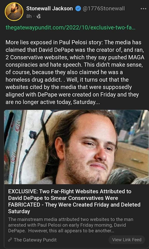 More lies exposed in Paul Pelosi story: The media has claimed that David DePape was the creator of, and ran, 2 Conservative websites, which they say pushed MAGA conspiracies and hate speech. This didn't make sense, of course, because they also claimed he was a homeless drug addict. Well, it turns out that the websites cited by the media that were supposedly aligned with DePape were created on Friday and they are no longer active today, Saturday. {{-Item |Cat=