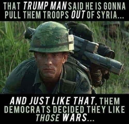 That Trump man said he'd pull them troops out of Syria... and just like that, them Democrats decided they like those wars... (Forrest Gump)