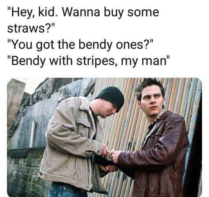 "Hey kid, you wanna buy some straws? I got bendy ones with stripes" (Drug deal).